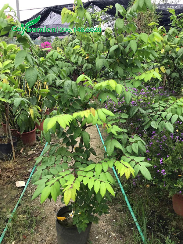 Cây thuộc họ lá kép, mọc cách, dài khoảng 30 – 50cm. Mỗi lá có từ 7 – 13 lá chét hình trứng, đầu lá nhọn, các lá bên mọc đối, 1 lá mọc chính giữa ở đỉnh. Lá có màu xanh lục, mặt lá trên sẽ đậm màu hơn mặt lá dưới. Bề mặt lá nhẵn mịn, mép lá nguyên.